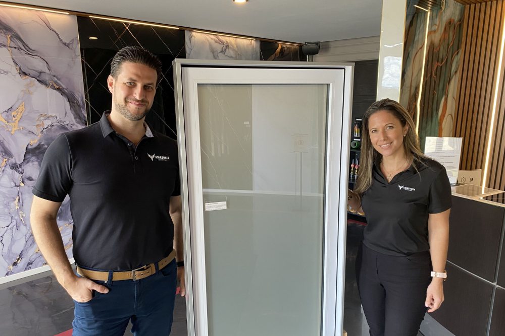 Propriété de Benjamin Grand et Jessie Petit, Amazonia Entreprise est spécialisée dans l’installation de film haute technologie permettant de passer d’une vitre claire à opaque sous la simple activation d’un interrupteur.