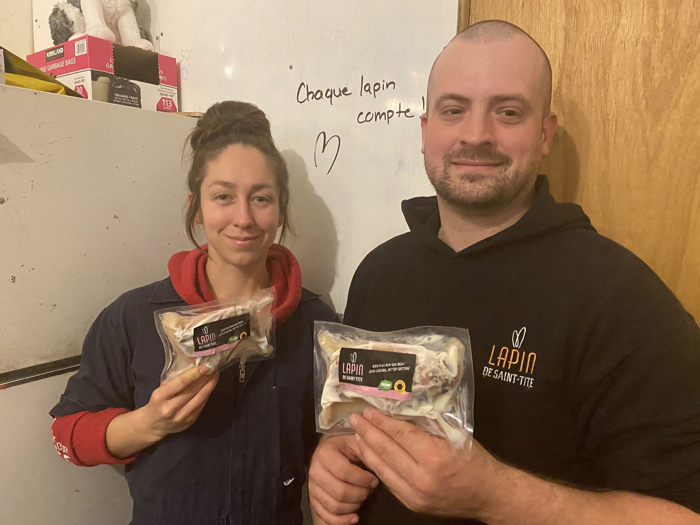 Le couple explore également les débouchés reliés à l’alimentation animale avec les restes des carcasses de leurs lapins une fois passés par l’abattoir. “Du côté de la consommation animale, la viande crue est un marché en pleine croissance. Et la protéine animale du lapin est la seule, avec celle du canard, que tu peux donner à tes animaux qui sont hypoallergéniques. Et comme la viande de lapin est très maigre, elle offre un super potentiel”, ajoute Pascal Côté qui compte valoriser les abats et les os restants des lapins en les moulant très finement pour former une pâte ne contenant aucune farine. “La demande de permis est faite et on a fait attester notre procédé par un agronome”, ajoute Jasmine Vigeant.