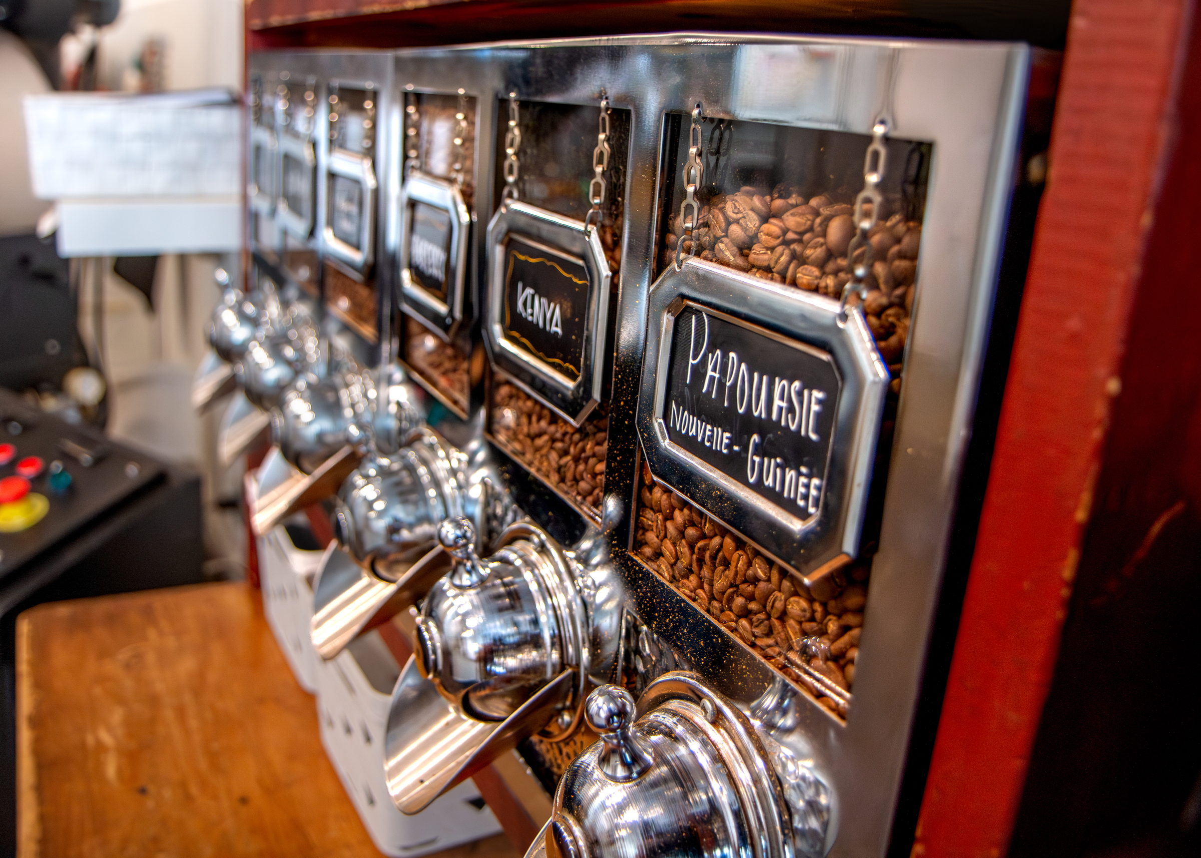 Sur les étagères de la brûlerie, des photos racontent ce voyage gustatif, témoignant de la passion et de la curiosité qui nourrissent ses créations.
