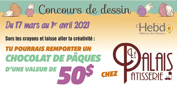 Concours Concours de dessin de Pâques Du 15 mars au 1er avril 2021 Ce concours et terminé. Surveillez nos prochains concours!