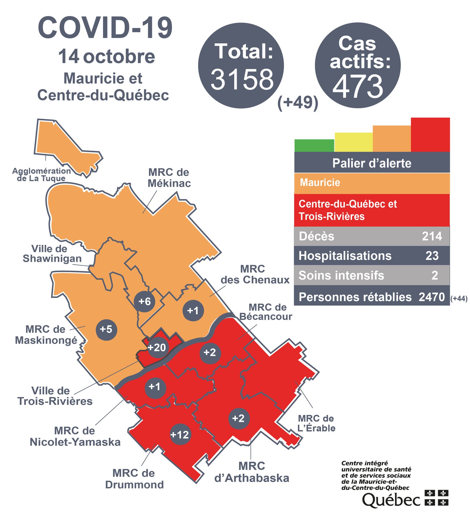 Dans son bilan du jour, le CIUSSS-MCQ rapporte en effet 49 nouveaux cas, dont 18 pour le Centre-du-Québec et 31 pour la Mauricie.